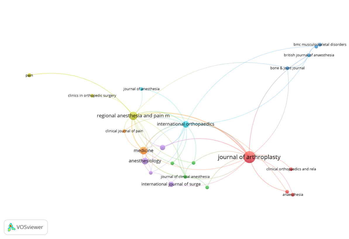 The bibliometric study examines the most productive and co-cited journals in the field of nerve block in knee replacement surgery, based on data retrieved from the Web of Science. By analyzing journal citations and co-citation networks, we can identify influential sources, determine research trends, and assess the interdisciplinary nature of this topic. Understanding these patterns is crucial for recognizing the leading contributors to the field and guiding future research efforts. To determine the most productive and co-cited journals, we identified those most frequently cited within the dataset. Table 3 presents the top 10 productive and co-cited journals, ranked based on total citations and total link strength, which measures the frequency of co-citations. This ranking provides insight into which journals serve as the primary sources of knowledge dissemination within this research area. The journal co-citation network was analyzed using VOSviewer, and a network visualization graph was generated to illustrate citation relationships between journals. In this network, nodes represent journals with size indicating total citations, edges represent co-citation links showing connections between frequently cited journals, and clusters indicate thematic groupings based on research focus. The Journal of Arthroplasty emerged as the most cited journal, reinforcing its role as a central knowledge hub in knee replacement surgery. Anesthesiology, Regional Anesthesia & Pain Medicine, and International Orthopaedics formed a closely linked cluster, emphasizing the interdisciplinary nature of nerve block research. Orthopedic and anesthesia-related journals exhibited strong co-citation relationships, indicating that pain management and surgical techniques are deeply interconnected.