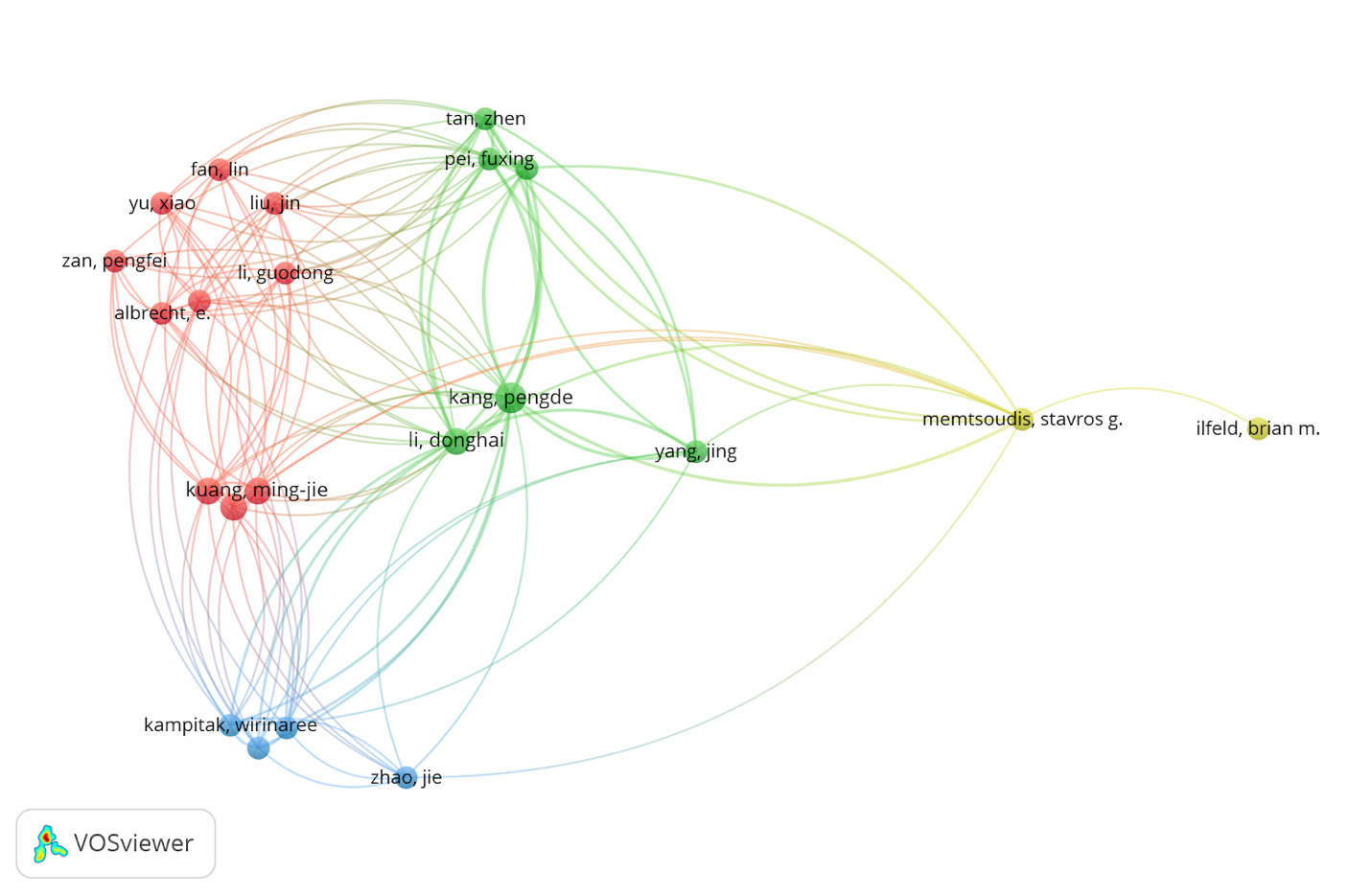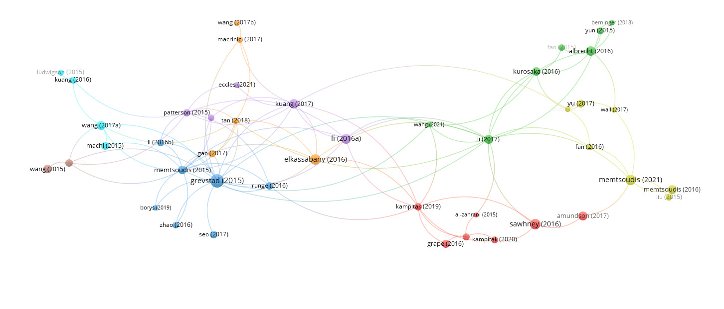 The network visualization map of the co-cited authors is shown in Figure 6. Four clusters were obtained from the analysis. The largest nodes were associated with the most frequently co-cited authors, including Kuang, Ming-Jie (143 citations, TLS 16, cluster 1), Kang, Pengde (202 citations, TLS 42, cluster 2), Zhao, Jie (115 citations, TLS 9, cluster 3), and Memtsoudis, Stavros G. (132 citations, TLS 17, cluster 4).