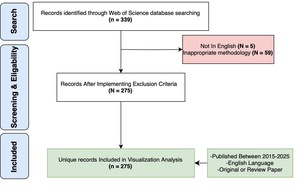 A total of 339 records were initially identified through the Web of Science database search. Following the application of exclusion criteria, 5 records were excluded for being published in a non-English language, and an additional 59 records were excluded for having inappropriate methodologies. Consequently, 275 records were retained for further analysis. All included records were published between 2015 and 2025, written in English, and classified as either original research articles or review papers. These 275 unique records formed the basis for the visualization analysis, providing a focused dataset for the study. For a detailed illustration of the characteristics of desired publications, see (Figure 1)