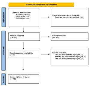 The flow diagram of our search strategy is presented in Figure 1. A total of 693 potentially relevant studies were found through computer search and manual screening of reference lists. Having removed all duplicates, 494 articles remained for evaluation. After screening the titles and abstracts, 416 studies were excluded, and full texts of 78 articles were evaluated and screened for relevance to the review’s topic. In total, 478 studies were excluded after a detailed assessment. The remaining 16 articles were included in our systematic review.