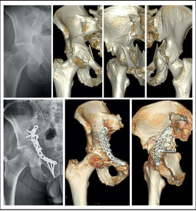 Displaced complex acetabular fractures usually require open reduction and internal fixation, because of high incidence of unacceptable results following conservative treatment.8 The management of these fractures is laborious for trauma surgeon due to its deep location and complex anatomy. Moreover, fixation might become technically challenging in case of osteoporous bone. The cohort of the present study was characterized by an age range of 22 to 86 years. Indeed, it is known that complex acetabular fracture might occur following a high energy (i.e. car accident) or low energy trauma (i.e. simple fall) especially in case of frail, elderly and osteoporotic patients. For these reasons, additional injuries, comorbidities, bone quality, and surgical risk need to take into consideration in the diagnostic and therapeutic course of the patient.9
